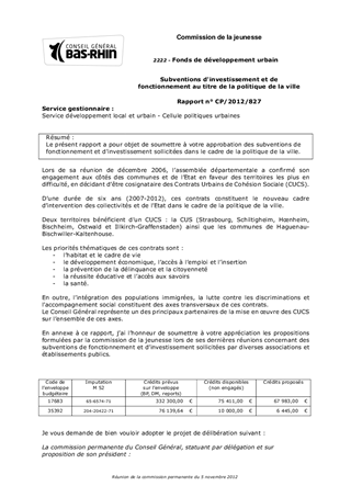 Le présent rapport a pour objet de soumettre à votre approbation des subventions de fonctionnement et d'investissement sollicitées dans le cadre de la politique de la ville.