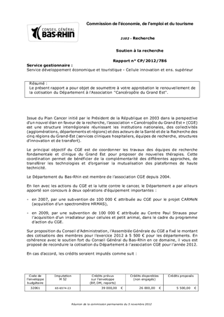 Le présent rapport a pour objet de soumettre à votre approbation le renouvellement de la cotisation du Département à l'Association ''Cancéropôle du Grand Est''.