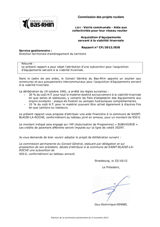Le présent rapport a pour objet l'attribution d'une subvention pour l'acquisition d'équipements servant à la viabilité hivernale.