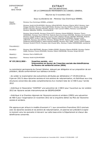 Les ateliers de redynamisation, les épiceries sociales et certaines associations intervenant sur tout le territoire départemental, dans des domaines spécifiques (Arpomt, Mobilex, Tôt ou T'Art, Redecome, Le Parcours, SOS Aide aux Habitants Neuhof et la CRES), contribuent depuis plusieurs années à l'insertion des bénéficiaires du RSA du département. Le présent rapport a pour objet de soumettre à votre validation un soutien complémentaire au montant des subventions 2012 votées en début d'exercice concernant deux épiceries sociales et trois ateliers de redynamisation, complément représentant un total de 12 400 €. Il propose également l'attribution d'une subvention à la nouvelle épicerie sociale intercommunale de Geispolsheim portée par Caritas et à la Chambre de l'économie sociale et solidaire, dans le cadre du Mois de l'économie sociale et solidaire en novembre 2012.