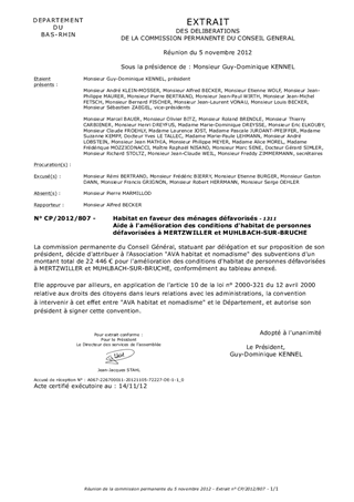 Le présent rapport concerne les trois demandes de subvention départementale de l'association 'AVA habitat et nomadisme' pour l'amélioration des conditions d'habitat de ménages en situation d'habitat précaire à MUHLBACH-SUR-BRUCHE et MERTZWILLER.