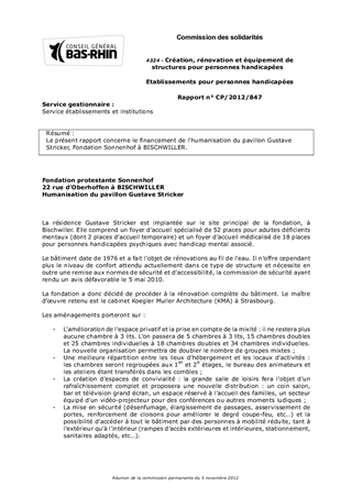 Le présent rapport concerne le financement de l'humanisation du pavillon Gustave Stricker, Fondation Sonnenhof à BISCHWILLER.
