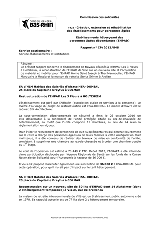 Le présent rapport concerne le financement de travaux réalisés à l'EHPAD Les 3 Fleurs à Holtzheim, la reconstruction de l'EHPAD de Villé sur un nouveau site et l'acquisition de matériel et mobilier pour l'EHPAD Home Saint Joseph à Thal Marmoutier, l'EHPAD Marquaire à Mutzig et la maison de retraite Stoltz Grimm à Andlau