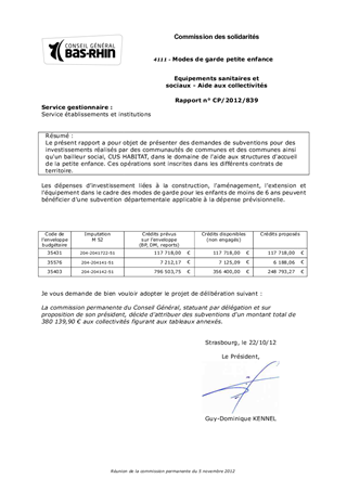 Le présent rapport a pour objet de présenter des demandes de subventions pour des investissements réalisés par des communautés de communes et des communes ainsi qu'un bailleur social, CUS HABITAT, dans le domaine de l'aide aux structures d'accueil de la petite enfance. Ces opérations sont inscrites dans les différents contrats de territoire.