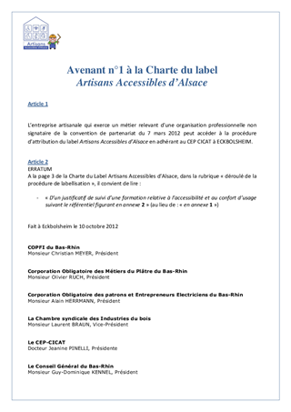 Avenant à la Charte du label ''Artisans accessibles d'Alsace''
