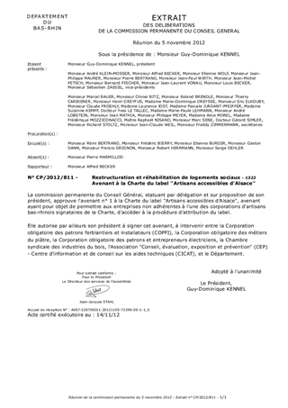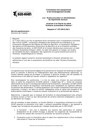 Le 7 mars 2012 a eu lieu la signature d'une convention avec 4 corporations d'artisans bas-rhinois (COPFI - corporation obligatoire des ferblantiers et installateurs, la Corporation Obligatoire des Métiers du Plâtre du Bas-Rhin, la Corporation Obligatoire des patrons et Entrepreneurs Electriciens du Bas-Rhin et la La Chambre syndicale des Industries du bois), le CEP-CICAT et le Conseil Général pour promouvoir un label 'Artisans Accessibles d'Alsace' (AAA). Ce label doit garantir à l'usager une chaîne de compétences dans l'adaptation des logements à la perte d'autonomie entre le financeur, l'ergothérapeute et l'artisan. Le présent rapport concerne l'avenant permettant à d'autres entreprises non adhérentes à l'une des 4 corporations de bénéficier du label 'Artisans Accessibles d'Alsace'.