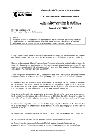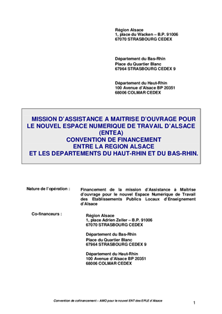 Projet de convention déterminant les modalités de financement par la Région et les Départements du Haut-Rhin et du Bas-Rhin d'une mission d'assistance à maîtrise d'ouvrage pour le nouvel Espace Numérique de Travail d'Alsace - ENTEA.