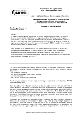 Le présent rapport vise à répondre à un besoin spécifique identifié par l'UTAMS de Saverne concernant la mobilisation de logements et/ou d'hébergement d'urgence pour mettre à l'abri des ménages, notamment avec enfants. Parallèlement, la SIBAR rencontre sur le secteur ouest du département des difficultés de mise en location de logements, en particulier pour les logements issus de la SCIRS (société de construction immobilière de la région de Saverne). Dans le cadre de la mise en oeuvre des actions de territorialisation de la politique départementale de l'habitat, la mobilisation du bâti existant a été priorisée sur les secteurs des SCoTs de Saverne et de l'Alsace Bossue. Il est proposé une expérimentation qui pourrait être engagée à Neuwiller les Saverne pour 2 logements pour la période hivernale 2012-2013.