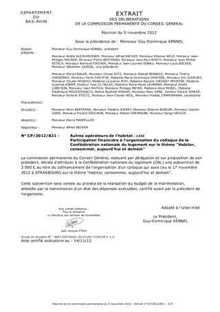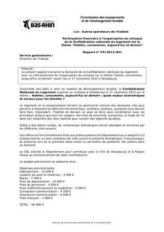Le présent rapport concerne la demande de la Confédération nationale du logement pour un cofinancement de l'organisation du colloque sur le thème 'habiter, consommer, aujourd'hui et demain' ayant lieu le 17 novembre 2012 à Strasbourg.