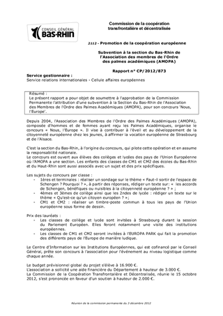 Le présent rapport a pour objet de soumettre à l'approbation de la Commission Permanente l'attribution d'une subvention à la Section du Bas-Rhin de l'Association des Membres de l'Ordre des Palmes Académiques (AMOPA), pour son concours 'Nous, l'Europe'.