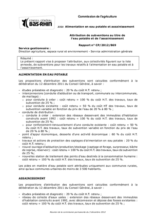 Le présent rapport vise à proposer l'attribution, aux collectivités figurant sur la liste annexée, de subventions pour les travaux relatifs à l'alimentation en eau potable et à l'assainissement.