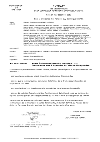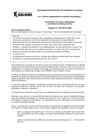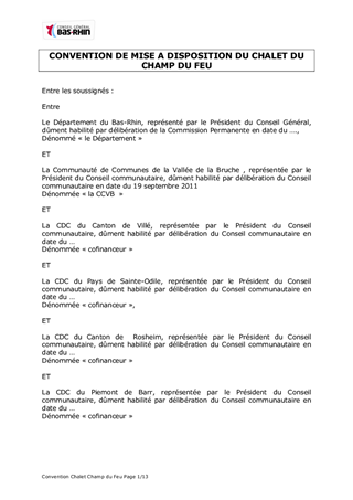 Le nouveau Chalet du Champ du Feu, propriété du Département du Bas-Rhin, sera remis, par convention, à la Communauté de Communes de la Haute-Bruche. Cette dernière fera son affaire des contrats de maintenance et d'entretien concernant l'ensemble des espaces accueillant le public. Elle répercutera l'ensemble des charges, y compris de personnel et de déplacement, sur ses partenaires, à savoir les Communautés de Communes du Piémont de Barr, du Canton de Villé, du Canton de Rosheim et du Pays de Sainte-Odile au prorata des surfaces chauffées, soit 631,61 m². Le Département assure la prise en compte des charges correspondant aux espaces attribués au Comité départemental de Ski, soit 193 m².