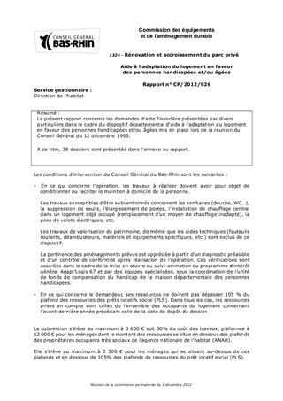 Le présent rapport concerne les demandes d'aide financière présentées par divers particuliers dans le cadre du dispositif départemental d'aide à l'adaptation du logement en faveur des personnes handicapées et/ou âgées mis en place lors de la réunion du Conseil Général du 12 décembre 1995. A ce titre, 38 dossiers sont présentés dans l'annexe au rapport.