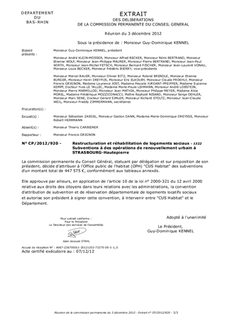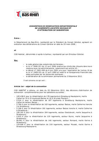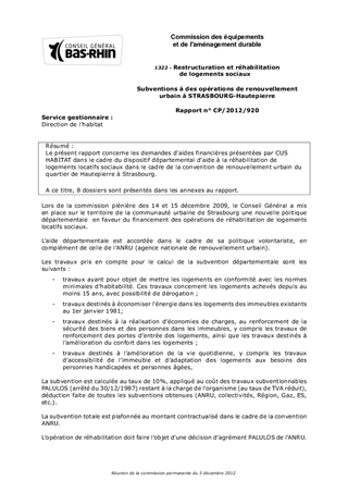 Le présent rapport concerne les demandes d'aides financières présentées par CUS HABITAT dans le cadre du dispositif départemental d'aide à la réhabilitation de logements locatifs sociaux dans le cadre de la convention de renouvellement urbain du quartier de Hautepierre à Strasbourg. A ce titre, 8 dossiers sont présentés dans les annexes au rapport.