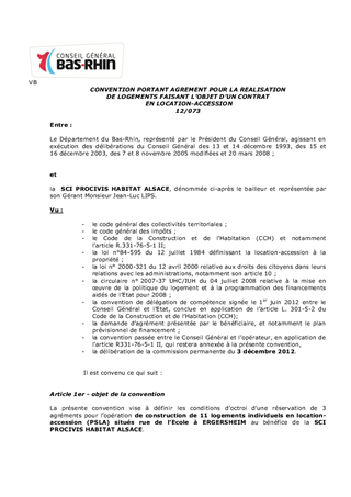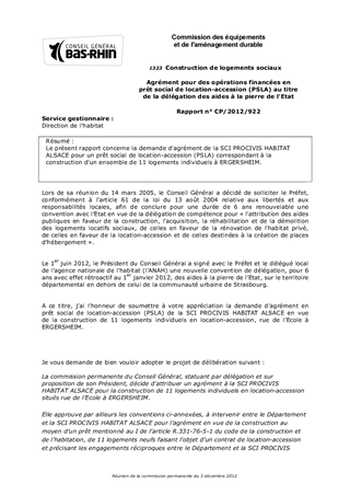 Le présent rapport concerne la demande d'agrément de la SCI PROCIVIS HABITAT ALSACE pour un prêt social de location-accession (PSLA) correspondant à la construction d'un ensemble de 11 logements individuels à ERGERSHEIM.
