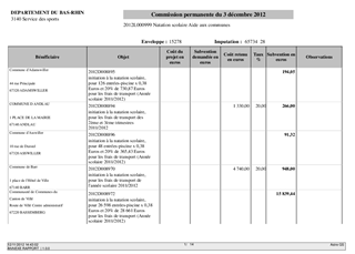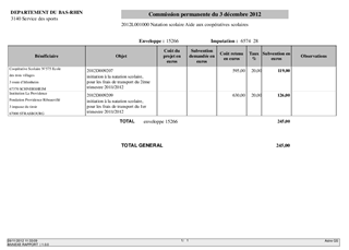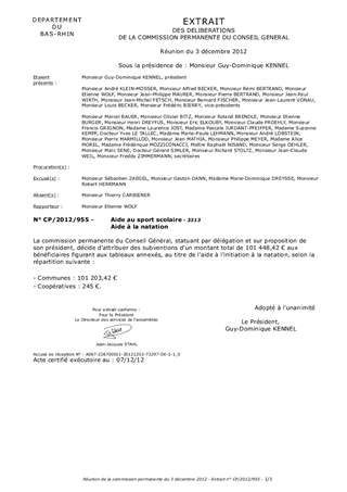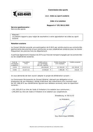 Aide à la natation Resumé Le présent rapport a pour objet de soumettre à votre approbation les aides au sport scolaire. Pièces jointes Délibération Rapport 3313 Natation scolaire Communes.pdf 3313 Natation scolaire Coopératives.pdf Assemblée : Commission Permanente Date : 03/12/2012 Rapporteur : Monsieur Etienne WOLF Collectivité : Conseil départemental du Bas-Rhin Direction : Direction de la jeunesse et des sports Service : Service des sports Domaine : Non renseigné Commission : K - Commission des sports
