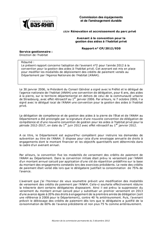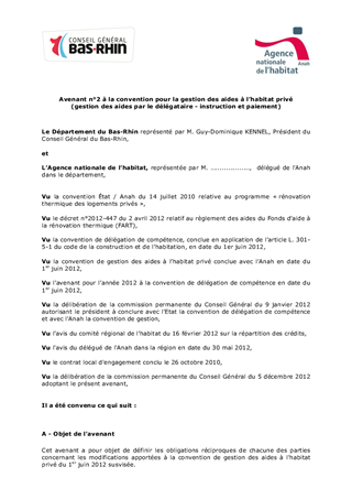 Le présent rapport concerne l'adoption de l'avenant n°2 pour l'année 2012 à la convention pour la gestion des aides à l'habitat privé. Cet avenant est mis en place pour modifier les modalités de déploiement des crédits de paiement versés au Département par l'Agence Nationale de l'Habitat (ANAH).