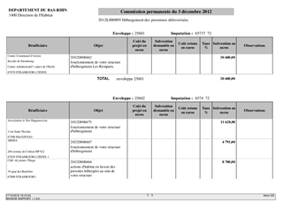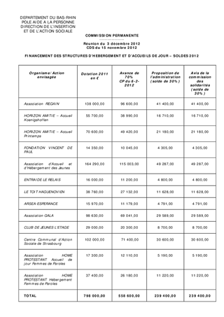 Financement 2012 des organismes en charge de l'hébergement et de l'accueil de jour
