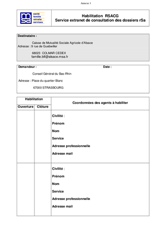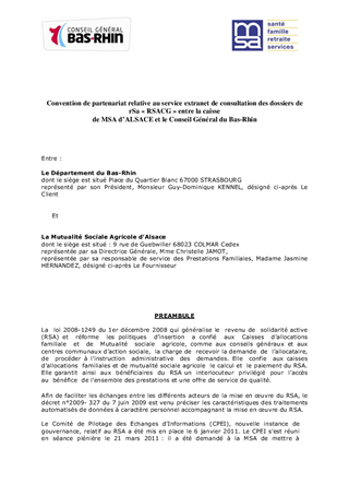 La Mutualité Sociale Agricole (MSA) est l'organisme en charge du service de l'allocation RSA pour l'ensemble des bénéficiaires affiliés à son régime. L'objet du présent rapport est d'organiser les conditions d'accès des agents du Conseil Général en charge du RSA au portail extranet mis en place par la MSA et mettant à disposition des informations personnelles relatives aux allocataires.