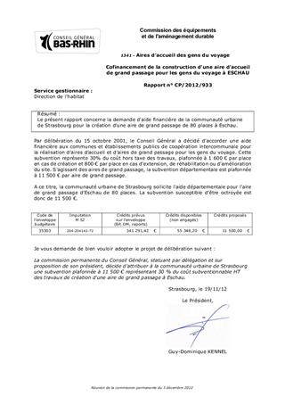 Le présent rapport concerne la demande d'aide financière de la communauté urbaine de Strasbourg pour la création d'une aire de grand passage de 80 places à Eschau.