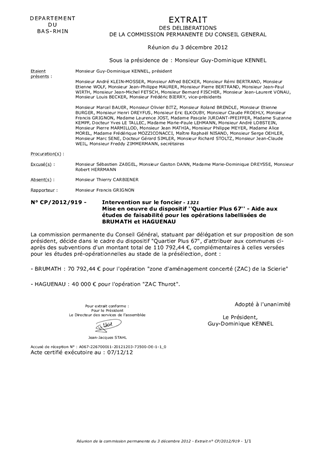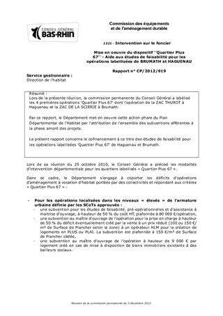 Lors de la présente réunion, la commission permanente du Conseil Général a labélisé les 4 premières opérations 'Quartier Plus 67' dont l'opération de la ZAC THUROT à Haguenau et la ZAC DE LA SCIERIE à Brumath. Par ce rapport, le Département met en oeuvre cette action phare du Plan Départemental de l'Habitat par l'attribution de l'ensemble des subventions afférentes à la phase amont des projets. Le présent rapport concerne le cofinancement à ce titre des études de faisabilité pour les opérations labellisées 'Quartier Plus 67' de Haguenau et Brumath.