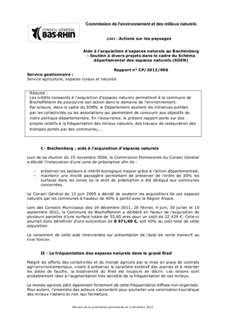 Les crédits consacrés à l'acquisition d'espaces naturels permettent à la commune de Bischoffsheim de poursuivre son action dans le domaine de l'environnement. Par ailleurs, dans le cadre du SDEN, le Département soutient les initiatives portées par les collectivités ou les associations qui permettent de concourir aux objectifs de notre politique départementale. En l'occurrence, le présent rapport porte sur des projets relatifs à la fréquentation des milieux naturels, des travaux de restauration des biotopes portés par des communes,...