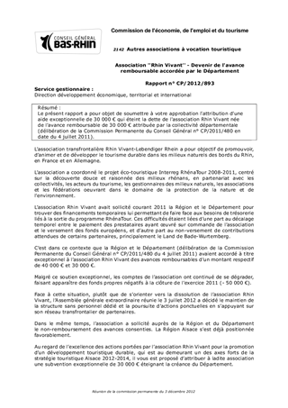 Le présent rapport a pour objet de soumettre à votre approbation l'attribution d'une aide exceptionnelle de 30 000 € qui éteint la dette de l'association Rhin Vivant née de l'avance remboursable de 30 000 € attribuée par la collectivité départementale (délibération de la Commission Permanente du Conseil Général n° CP/2011/480 en date du 4 juillet 2011).