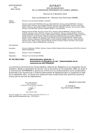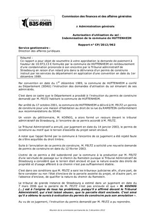 Ce rapport a pour objet de soumettre à votre approbation la demande de paiement à hauteur de 10.973,13 € formulée par la commune de HUTTENHEIM en remboursement d'une condamnation prononcée à son encontre par le Tribunal administratif de Strasbourg en raison d'un retard pris dans la délivrance d'un permis de construire instruit par les services du département en application d'une convention en date du 1er décembre 1989.