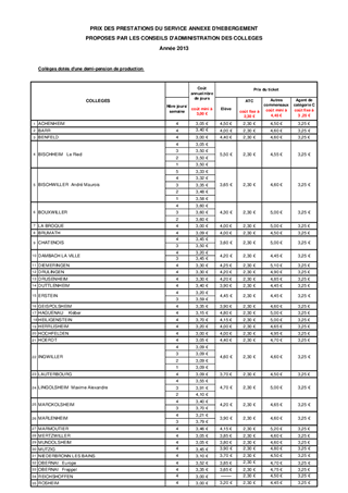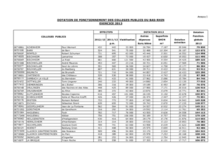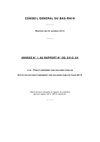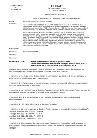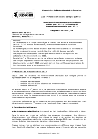Le Département a la charge des collèges. A ce titre, il en assure le fonctionnement (article L.213-2 du code de l'éducation) au moyen notamment de dotations financières. Le montant prévisionnel de ces dotations doit être notifié avant le 1er novembre de l'année précédant l'exercice considéré (article L.421-11 du code susvisé). Les propositions développées ci-après précisent les critères de répartition des dotations de fonctionnement pour 2013. Depuis 2007, le Département arrête par ailleurs les tarifs des restaurants scolaires des collèges disposant d'une cuisine de production, sur la base des propositions des établissements. Les tarifs 2013 ainsi votés doivent être notifiés avec les dotations de fonctionnement avant le 1er novembre 2012.