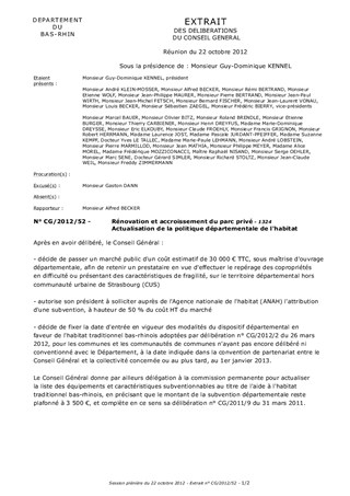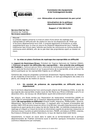 Le présent rapport concerne la mise en place d'une action de repérage des copropriétés en difficulté afin de mettre en oeuvre les dispositions de l'Anah sur le territoire départemental hors CUS. Il propose également d'introduire un délai supplémentaire pour la mise en oeuvre du dispositif départemental pour l'habitat traditionnel bas-rhinois dans l'attente que toutes les communes ou communautés de communes aient délibéré, afin de ne pas léser des propriétaires ayant un dossier en cours.