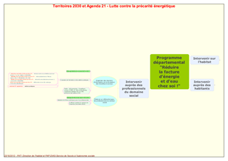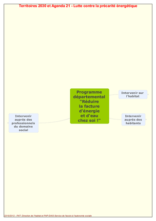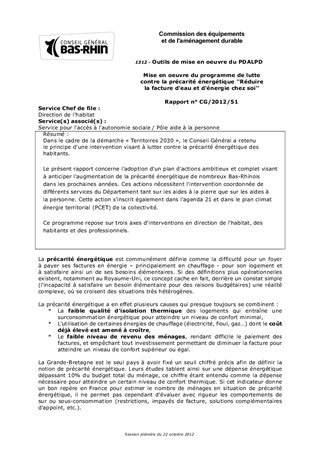 Dans le cadre de la démarche « Territoires 2030 », le Conseil Général a retenu le principe d'une intervention visant à lutter contre la précarité énergétique des habitants. Le présent rapport concerne l'adoption d'un plan d'actions ambitieux et complet visant à anticiper l'augmentation de la précarité énergétique de nombreux Bas-Rhinois dans les prochaines années. Ces actions nécessitent l'intervention coordonnée de différents services du Département tant sur les aides à la pierre que sur les aides à la personne. Cette action s'inscrit également dans l'agenda 21 et dans le plan climat énergie territorial (PCET) de la collectivité. Ce programme repose sur trois axes d'interventions en direction de l'habitat, des habitants et des professionnels.