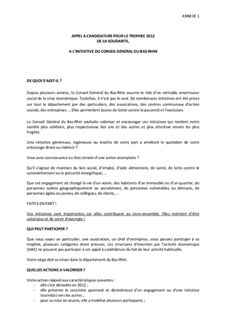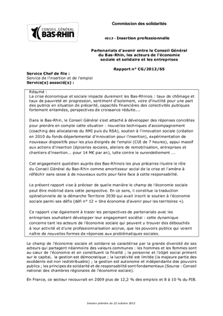 La crise économique et sociale impacte durement les Bas-Rhinois : taux de chômage et taux de pauvreté en progression, sentiment d'isolement, voire d'inutilité pour une part des publics en situation de précarité, capacités financières des collectivités publiques fortement entamées, perspectives de croissance réduite.... Dans le Bas-Rhin, le Conseil Général s'est attaché à développer des réponses concrètes pour prendre en compte cette situation : nouvelles techniques d'accompagnement (coaching des allocataires du RMI puis du RSA), soutien à l'innovation sociale (création en 2010 du fonds départemental d'innovation pour l'insertion), expérimentation de nouveaux dispositifs pour les plus éloignés de l'emploi (CUI de 7 heures), appui massif aux actions d'insertion (épiceries sociales, ateliers de remobilisation, entreprises et chantiers d'insertion... pour 14 M€ par an), lutte contre le surendettement ... Cet engagement quotidien auprès des Bas-Rhinois les plus précaires illustre le rôle du Conseil Général du Bas-Rhin comme amortisseur social de la crise et l'amène à réfléchir sans cesse à de nouveaux outils pour faire face à cette responsabilité. Le présent rapport vise à préciser de quelle manière le champ de l'économie sociale peut être mobilisé dans cette perspective. En ce sens, il constitue la traduction opérationnelle de la démarche Territoire 2030 qui avait inscrit le soutien à l'économie sociale parmi ses défis (défi n° 12 « Une économie d'avenir pour les territoires »). Ce rapport vise également à tracer les perspectives de partenariats avec les entreprises souhaitant développer leur engagement sociétal : cette dynamique concerne tant les acteurs de l'économie sociale qui peuvent y trouver des débouchés à leur activité et d'une professionnalisation accrue, que les pouvoirs publics qui voient naître de nouvelles formes de réponses aux problématiques sociales.