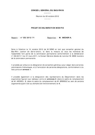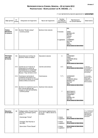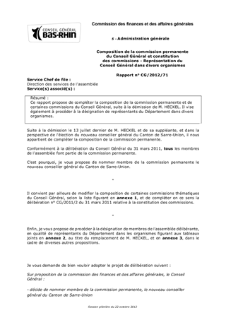 Ce rapport propose de compléter la composition de la commission permanente et de certaines commissions du Conseil Général, suite à la démission de M. HECKEL. Il vise également à procéder à la désignation de représentants du Département dans divers organismes.