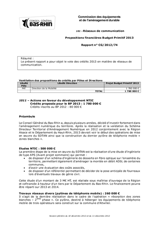 Propositions financières Budget Primitif 2013 Resumé Le présent rapport a pour objet le vote des crédits 2013 en matière de réseaux de communication. Pièces jointes Délibération Rapport Assemblée : Conseil General Date : 10/12/2012 Rapporteur : Monsieur Alfred BECKER Collectivité : Conseil départemental du Bas-Rhin Direction : Pôle aménagement du territoire Service : Direction de la mobilité Domaine : Non renseigné Commission : I - Commission des équipements et de l'aménagement durable