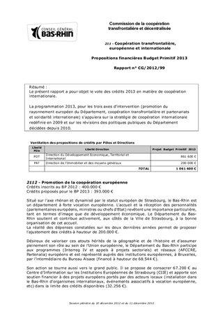 Le présent rapport a pour objet le vote des crédits 2013 en matière de coopération internationale. La programmation 2013, pour les trois axes d'intervention (promotion du rayonnement européen du Département, coopération transfrontalière et partenariats et solidarité internationale) s'appuiera sur la stratégie de coopération internationale redéfinie en 2009 et sur les révisions des politiques publiques du Département décidées depuis 2010.