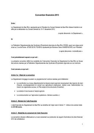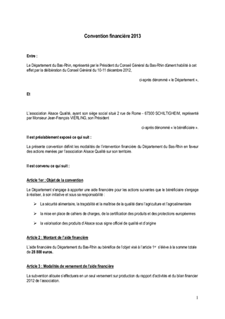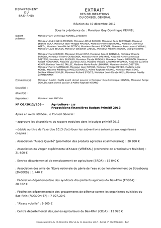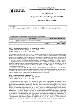 Propositions financières Budget Primitif 2013 Resumé Le présent rapport a pour objet le vote des crédits 2013 en matière d'agriculture. Pièces jointes Délibération Rapport Convention Alsace Qualité 2013.pdf Convention FDSEA 2013.pdf Convention VEREXAL 2013.pdf Assemblée : Conseil General Date : 10/12/2012 Rapporteur : Monsieur Jean MATHIA Collectivité : Conseil départemental du Bas-Rhin Direction : Direction agriculture, espace rural et environnement Service : Direction agriculture, espace rural et environnement - Service administration générale Domaine : Non renseigné Commission : B - Commission de l'agriculture