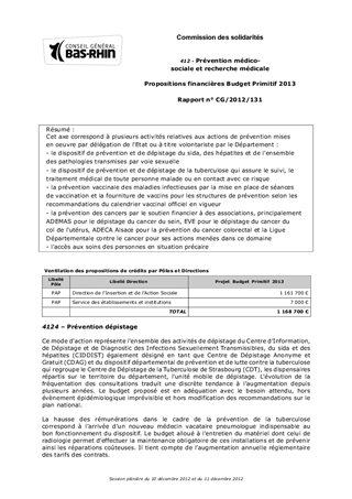 Cet axe correspond à plusieurs activités relatives aux actions de prévention mises en oeuvre par délégation de l'Etat ou à titre volontariste par le Département : - le dispositif de prévention et de dépistage du sida, des hépatites et de l'ensemble des pathologies transmises par voie sexuelle - le dispositif de prévention et de dépistage de la tuberculose qui assure le suivi, le traitement médical de toute personne malade ou en contact avec ce risque - la prévention vaccinale des maladies infectieuses par la mise en place de séances de vaccination et la fourniture de vaccins pour les structures de prévention selon les recommandations du calendrier vaccinal officiel en vigueur - la prévention des cancers par le soutien financier à des associations, principalement ADEMAS pour le dépistage du cancer du sein, EVE pour le dépistage du cancer du col de l'utérus, ADECA Alsace pour la prévention du cancer colorectal et la Ligue Départementale contre le cancer pour ses actions menées dans ce domaine - l'accès aux soins des personnes en situation précaire