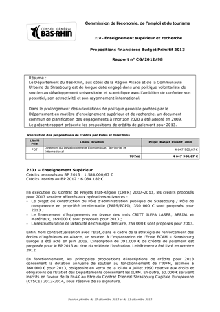 Le Département du Bas-Rhin, aux côtés de la Région Alsace et de la Communauté Urbaine de Strasbourg est de longue date engagé dans une politique volontariste de soutien au développement universitaire et scientifique avec l'ambition de conforter son potentiel, son attractivité et son rayonnement international. Dans le prolongement des orientations de politique générale portées par le Département en matière d'enseignement supérieur et de recherche, un document commun de planification des engagements à l'horizon 2020 a été adopté en 2009. Le présent rapport présente les propositions de crédits de paiement pour 2013.