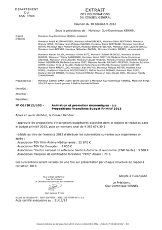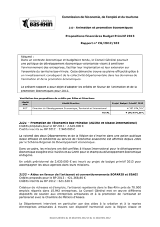 Dans un contexte économique et budgétaire tendu, le Conseil Général poursuit une politique de développement économique volontariste visant à améliorer l'environnement des entreprises, faciliter leur implantation et leur extension sur l'ensemble du territoire bas-rhinois. Cette démarche trouve sa pleine efficacité grâce à un investissement conséquent de la collectivité départementale dans les domaines de l'animation et de la promotion économiques. Le présent rapport a pour objet d'adopter les crédits en faveur de l'animation et de la promotion économiques pour 2013.