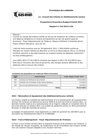 La prise en charge des enfants confiés au service de protection de l'enfance constitue une dépense obligatoire et s'exerce principalement au sein de quatre types de structures : Foyer Départemental de l'Enfance, Maisons d'Enfants à Caractère Social, Foyers d'Action Educative, Lieux de Vie. L'activité reste soutenue avec au 30 septembre 2012, 2 466 enfants confiés au Président du Conseil Général du Bas-Rhin (2 413 à la même date en 2011). Le nombre d'enfants accueillis a des répercussions sur plusieurs postes de dépenses notamment les frais d'hébergement. Les crédits 2013 (77 814 000 €) évoluent par rapport à 2012 (76 210 000 €) pour faire face à l'évolution des frais de personnel, des charges sociales afférentes et des dépenses liées à l'accueil des enfants.
