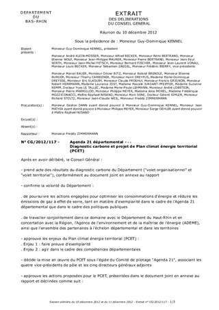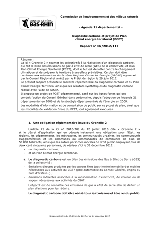 La loi « Grenelle 2 » soumet les collectivités à la réalisation d'un diagnostic carbone, qui fait le bilan des émissions de gaz à effet de serre (GES) de la collectivité, et d'un Plan Climat Energie Territorial (PCET), dont le but est de lutter contre le changement climatique et de préparer le territoire à ses effets prévisibles. Ce plan doit être conforme aux orientations du Schéma Régional Climat Air Energie (SRCAE) approuvé par le Conseil Régional et arrêté par le Préfet de région le 29 juin 2012. Le présent rapport présente le contexte réglementaire du diagnostic carbone et du Plan Climat Energie Territorial ainsi que les résultats synthétiques du diagnostic carbone réalisé avec l'aide de l'ASPA. Il propose un projet de PCET départemental, basé sur les lignes fortes qui ont conduit l'action du Conseil Général dans ce domaine, depuis l'adoption de l'Agenda 21 départemental en 2006 et de la stratégie départementale de l'énergie en 2008. Les modalités d'information et de consultation du public sur ce projet de plan, ainsi que les modalités de validation finale du PCET, sont également évoquées.