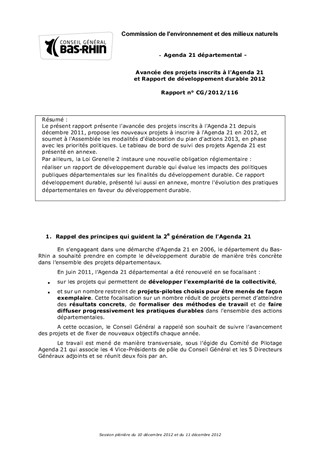 Le présent rapport présente l'avancée des projets inscrits à l'Agenda 21 depuis décembre 2011, propose les nouveaux projets à inscrire à l'Agenda 21 en 2012, et soumet à l'Assemblée les modalités d'élaboration du plan d'actions 2013, en phase avec les priorités politiques. Le tableau de bord de suivi des projets Agenda 21 est présenté en annexe. Par ailleurs, la Loi Grenelle 2 instaure une nouvelle obligation réglementaire : réaliser un rapport de développement durable qui évalue les impacts des politiques publiques départementales sur les finalités du développement durable. Ce rapport développement durable, présenté lui aussi en annexe, montre l'évolution des pratiques départementales en faveur du développement durable.
