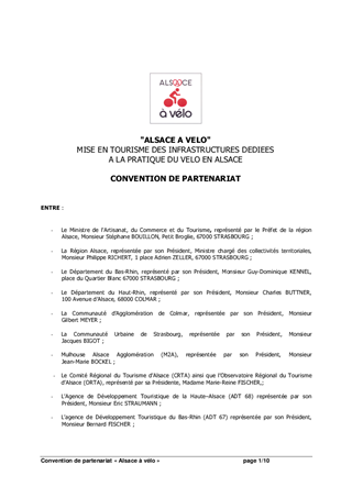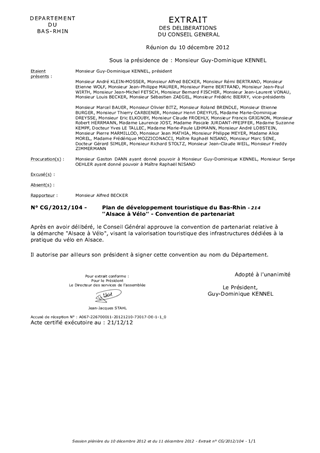 Les conclusions de l'étude concernant la mise en tourisme des infrastructures dédiées à la pratique du vélo en Alsace ont été rendues au cours de l'été 2012. Afin d'assurer la mise en oeuvre de l'ensemble des actions relevant des domaines de l'infrastructure, du jalonnement, des services mais également de la promotion et de la communication, le Conseil Général du Bas-Rhin est désigné, après s'être proposé, coordinateur du projet dénommé 'Alsace à Vélo'. Ce projet partenarial regroupe l'ensemble des trois grandes collectivités alsaciennes (Région Alsace, Conseil Général du Haut-Rhin, Conseil Général du Bas-Rhin), l'Etat (DIRRECTE), les trois agglomérations de Strasbourg, Colmar et Mulhouse ainsi que les deux Agences de Développement Touristique (ADT 67 et 68) et le Comité Régional du Tourisme. Un programme d'actions prévu sur la période 2012/14 s'inscrit dans le cadre de la Stratégie Touristique Alsace adoptée en juin dernier. Les ressources seront définies d'un commun accord entre les partenaires au fur et à mesure du déploiement de la démarche 'Alsace à vélo'.