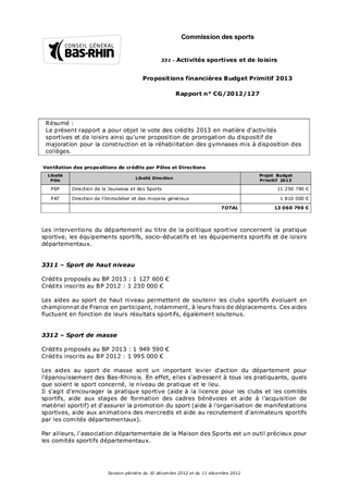 Le présent rapport a pour objet le vote des crédits 2013 en matière d'activités sportives et de loisirs ainsi qu'une proposition de prorogation du dispositif de majoration pour la construction et la réhabilitation des gymnases mis à disposition des collèges.