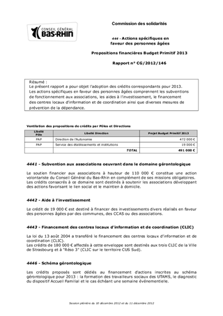 Le présent rapport a pour objet l'adoption des crédits correspondants pour 2013. Les actions spécifiques en faveur des personnes âgées comprennent les subventions de fonctionnement aux associations, les aides à l'investissement, le financement des centres locaux d'information et de coordination ainsi que diverses mesures de prévention de la dépendance.