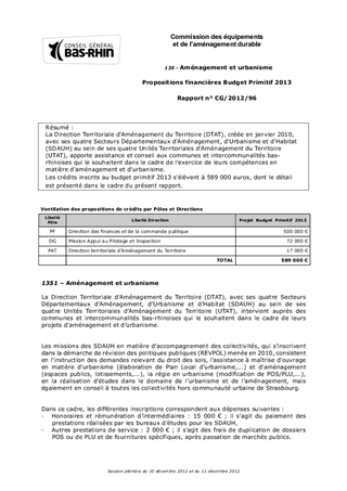 La Direction Territoriale d'Aménagement du Territoire (DTAT), créée en janvier 2010, avec ses quatre Secteurs Départementaux d'Aménagement, d'Urbanisme et d'Habitat (SDAUH) au sein de ses quatre Unités Territoriales d'Aménagement du Territoire (UTAT), apporte assistance et conseil aux communes et intercommunalités bas-rhinoises qui le souhaitent dans le cadre de l'exercice de leurs compétences en matière d'aménagement et d'urbanisme. Les crédits inscrits au budget primitif 2013 s'élèvent à 589 000 euros, dont le détail est présenté dans le cadre du présent rapport.