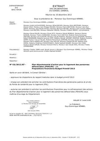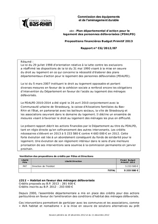 La loi du 29 juillet 1998 d'orientation relative à la lutte contre les exclusions a réaffirmé les dispositions de la loi du 31 mai 1990 visant à la mise en oeuvre du droit au logement en ce qui concerne la nécessité d'élaborer des plans départementaux d'action pour le logement des personnes défavorisées (PDALPD). La loi du 5 mars 2007 instituant le droit au logement opposable et portant diverses mesures en faveur de la cohésion sociale a renforcé encore les obligations d'intervention du Département en faveur de l'accès au logement des ménages défavorisés. Le PDALPD 2010-2014 a été signé le 26 avril 2010 conjointement avec la Communauté urbaine de Strasbourg, la caisse d'Allocations familiales du Bas-Rhin et l'Etat, en partenariat avec les bailleurs sociaux, la ville de Strasbourg et les associations oeuvrant dans le domaine du logement. Il décline un ensemble de mesures visant à favoriser le droit au logement des ménages les plus en difficulté. Le présent rapport décrit les actions financées par le Département au titre du PDALPD, tant en régie directe qu'en cofinancement des autres intervenants. Les crédits nécessaires s'élèvent en 2013 à 5 233 580 € contre 4 683 000 € en 2012. Cette forte évolution est liée à un abondement conséquent du fonds de solidarité pour le logement. Une évolution de son règlement intérieur dans le sens d'une meilleure priorisation de ses interventions sera soumise à la commission permanente en janvier prochain.