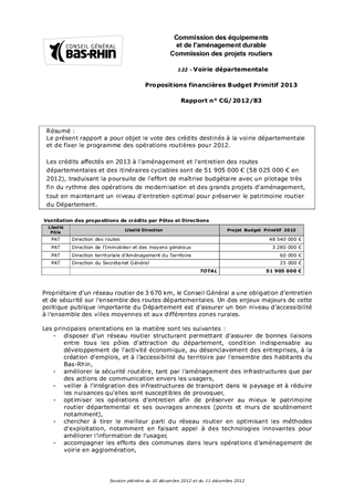 Le présent rapport a pour objet le vote des crédits destinés à la voirie départementale et de fixer le programme des opérations routières pour 2012. Les crédits affectés en 2013 à l'aménagement et l'entretien des routes départementales et des itinéraires cyclables sont de 51 905 000 € (58 025 000 € en 2012), traduisant la poursuite de l'effort de maîtrise budgétaire avec un pilotage très fin du rythme des opérations de modernisation et des grands projets d'aménagement, tout en maintenant un niveau d'entretien optimal pour préserver le patrimoine routier du Département.