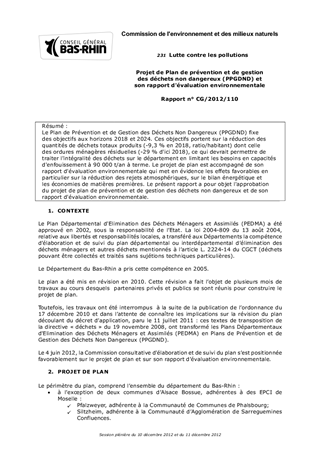 Le Plan de Prévention et de Gestion des Déchets Non Dangereux (PPGDND) fixe des objectifs aux horizons 2018 et 2024. Ces objectifs portent sur la réduction des quantités de déchets totaux produits (-9,3 % en 2018, ratio/habitant) dont celle des ordures ménagères résiduelles (-29 % d'ici 2018), ce qui devrait permettre de traiter l'intégralité des déchets sur le département en limitant les besoins en capacités d'enfouissement à 90 000 t/an à terme. Le projet de plan est accompagné de son rapport d'évaluation environnementale qui met en évidence les effets favorables en particulier sur la réduction des rejets atmosphériques, sur le bilan énergétique et les économies de matières premières. Le présent rapport a pour objet l'approbation du projet de plan de prévention et de gestion des déchets non dangereux et de son rapport d'évaluation environnementale.