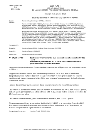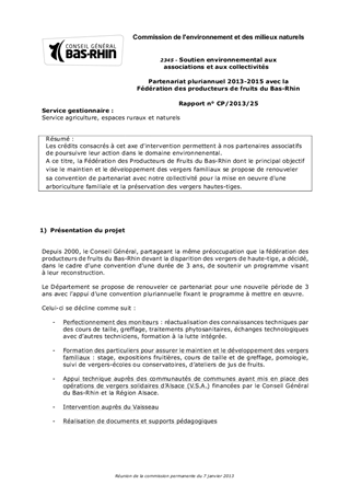 Les crédits consacrés à cet axe d'intervention permettent à nos partenaires associatifs de poursuivre leur action dans le domaine environnenental. A ce titre, la Fédération des Producteurs de Fruits du Bas-Rhin dont le principal objectif vise le maintien et le développement des vergers familiaux se propose de renouveler sa convention de partenariat avec notre collectivité pour la mise en oeuvre d'une arboriculture familiale et la préservation des vergers hautes-tiges.